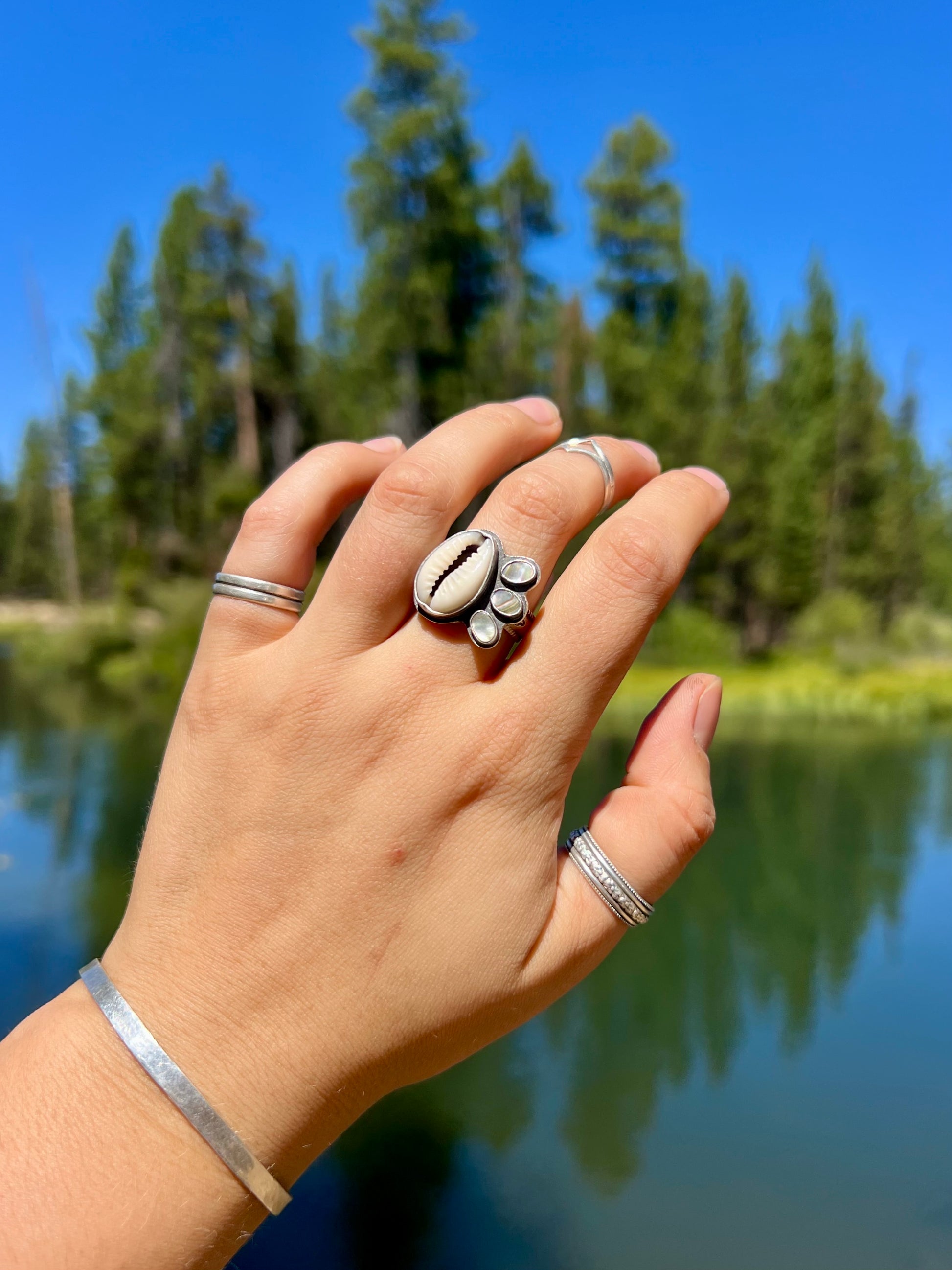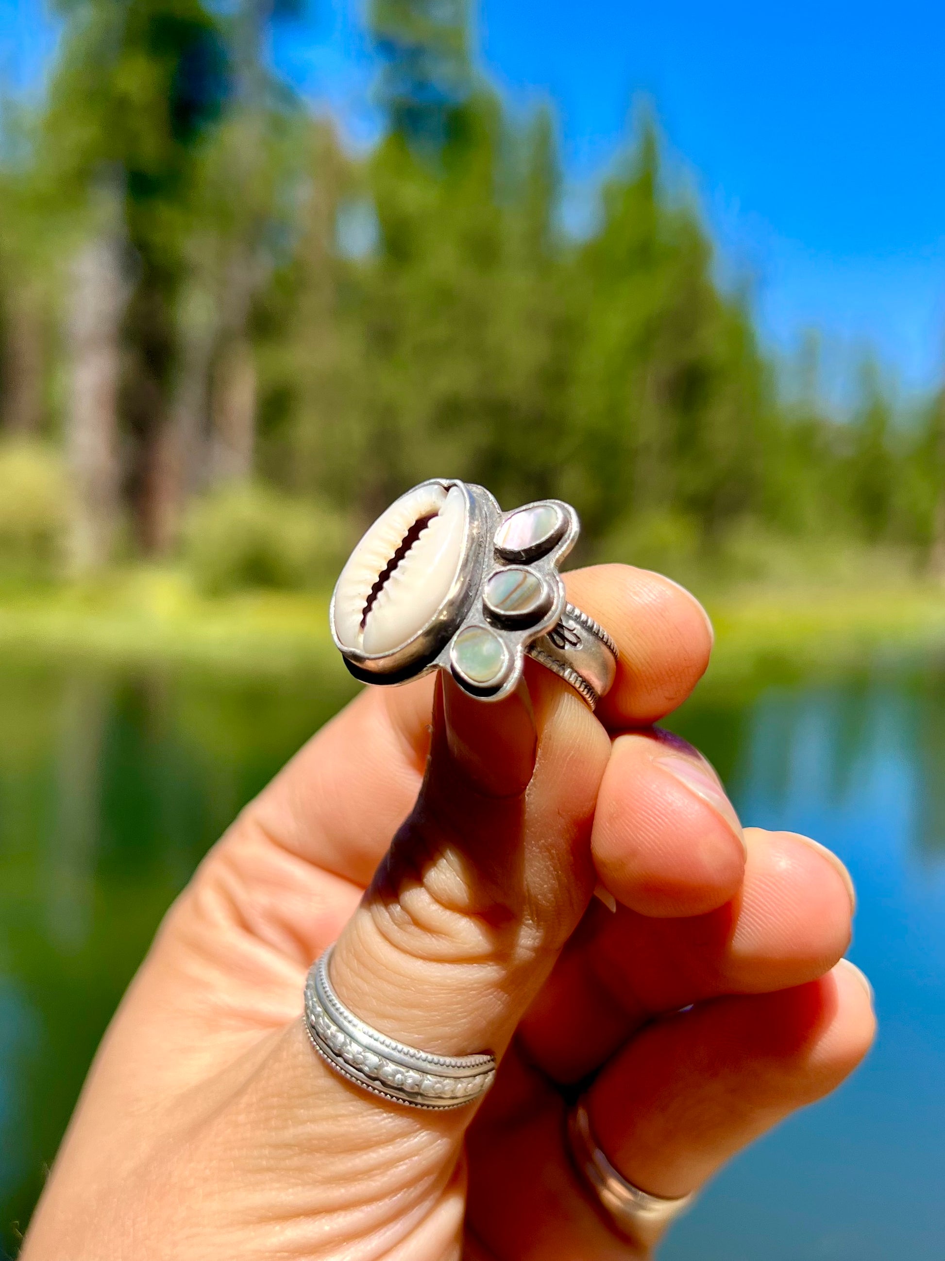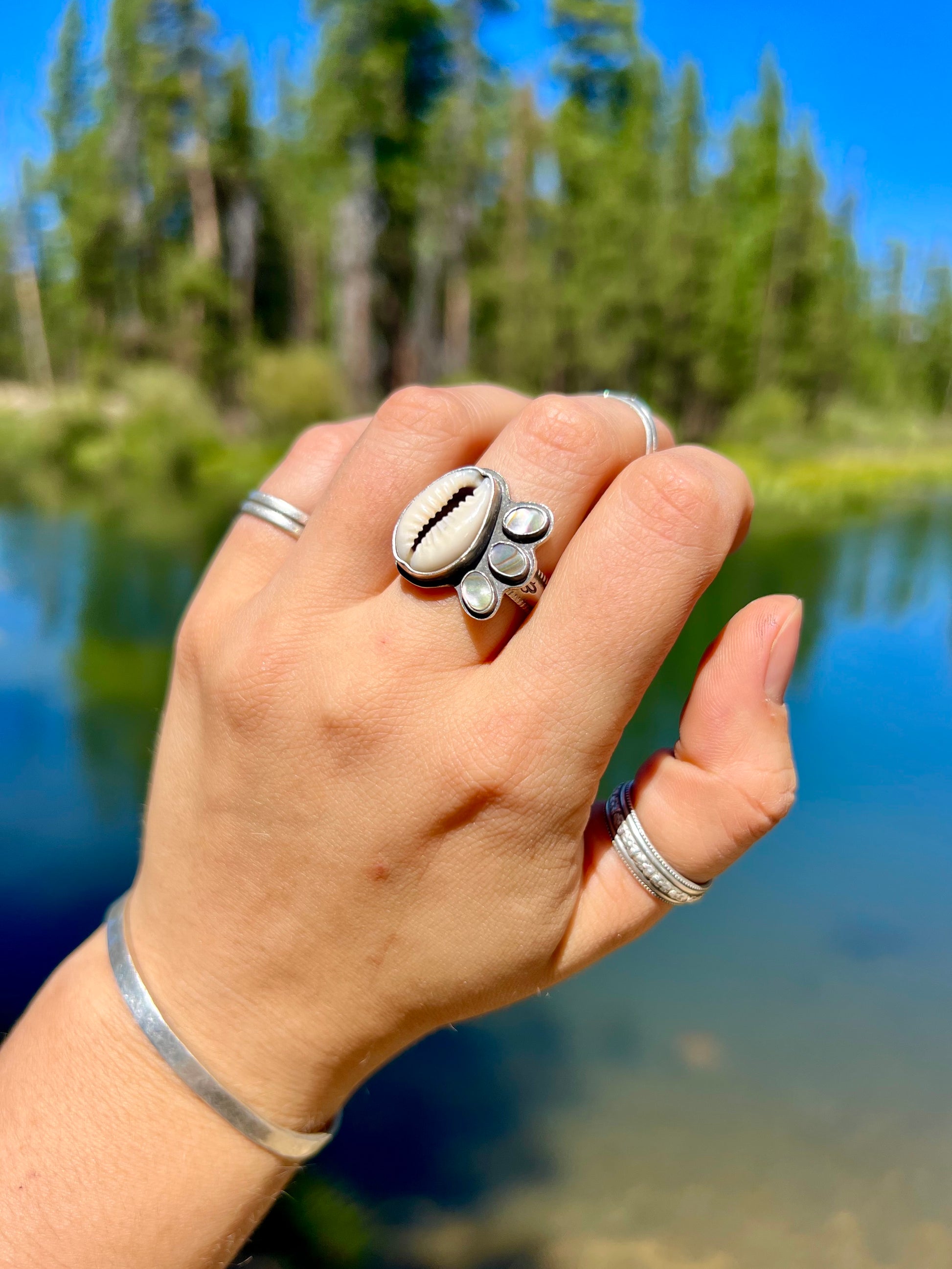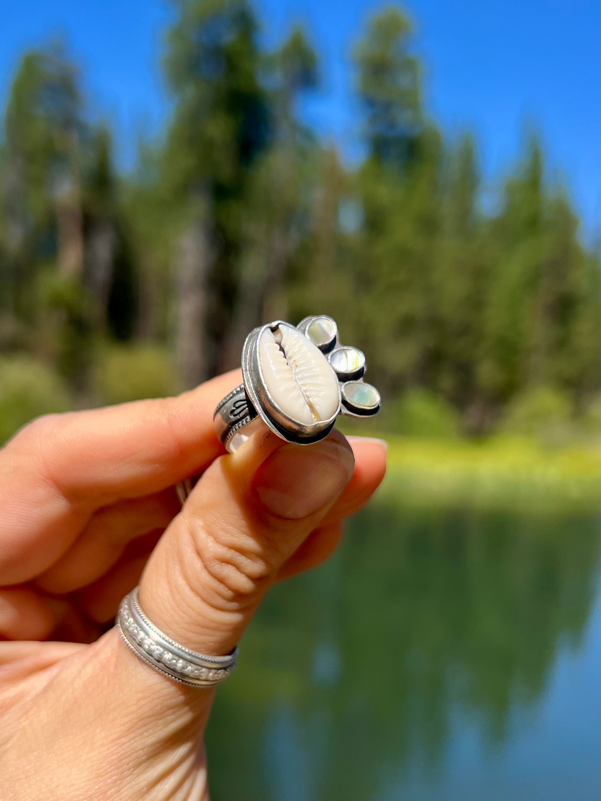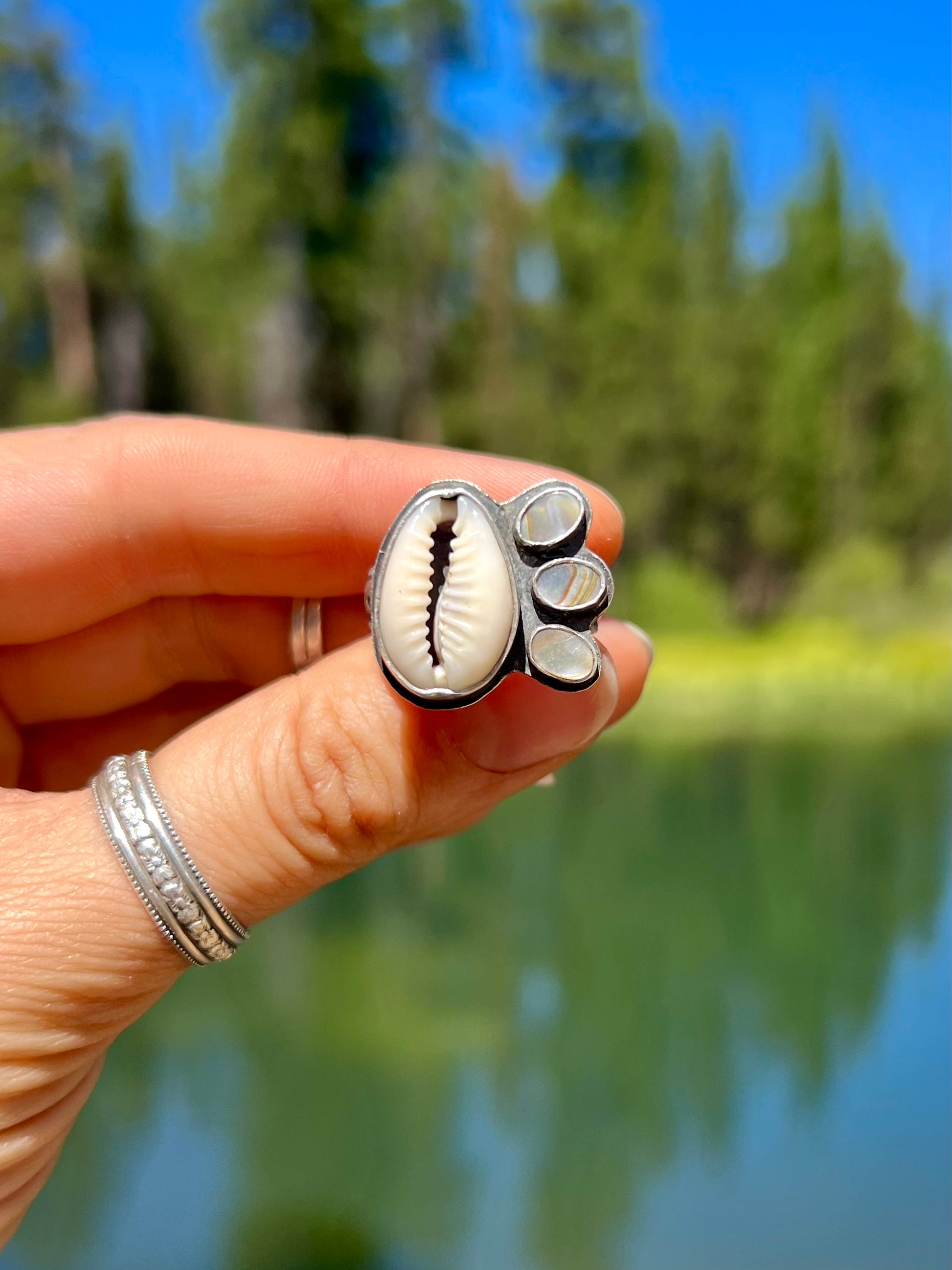 Materials: Sterling Silver, Puka (Cowry), Abalone
